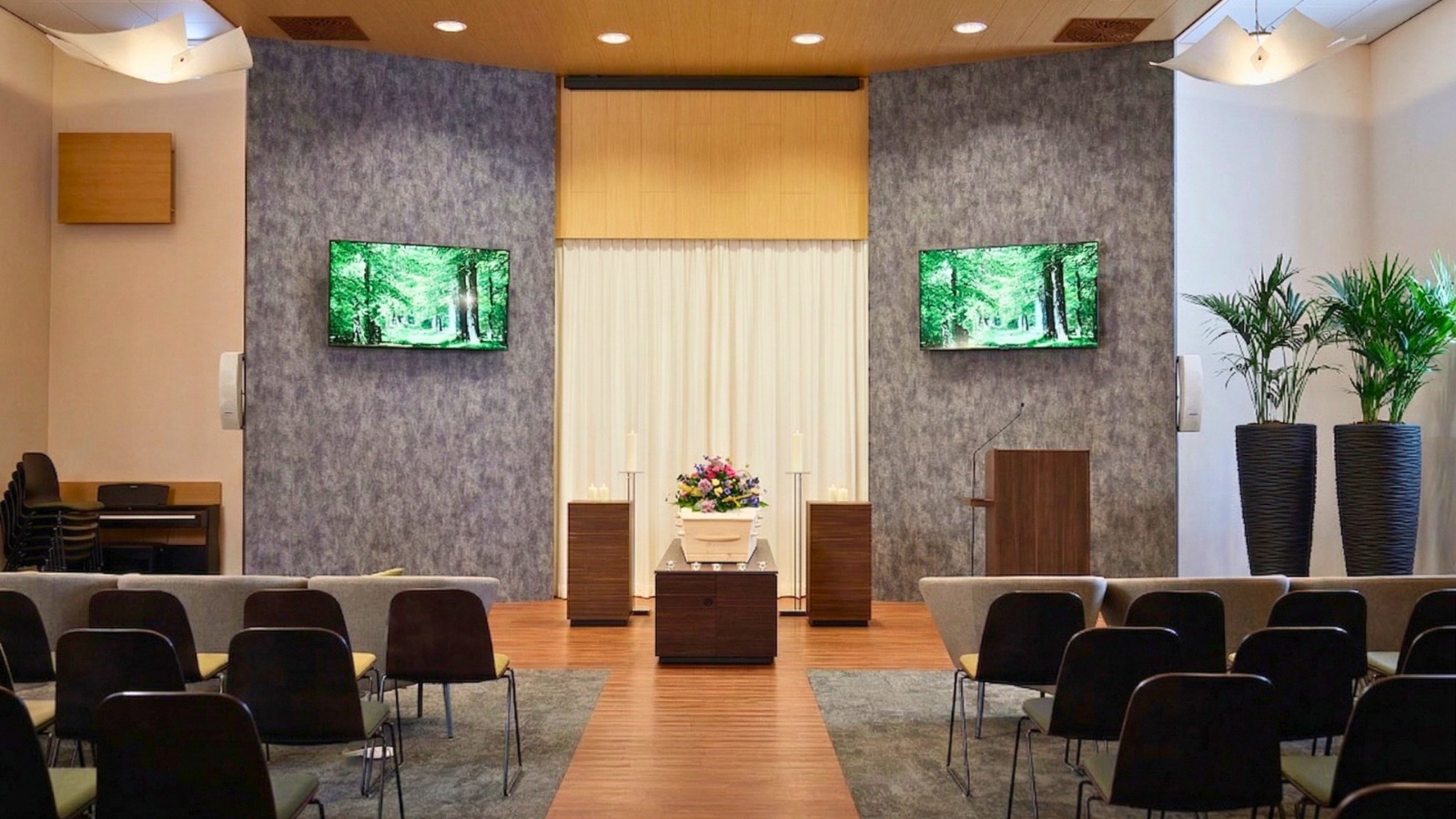 Vanuit de aangename ontvangstruimte van Crematorium De Reydtbeek worden uw genodigden begeleid naar de sfeervolle Aula La Baronne. Terwijl u zich voorbereidt op de ceremonie in de Familiekamer, kunnen uw genodigden een bericht achterlaten in het condoleanceregister.