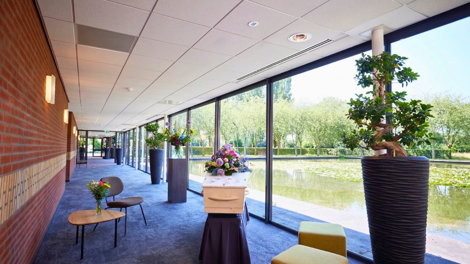 De eigentijdse architectuur, inrichting en het schitterende buitenterrein met grote vijver geven deze uitvaartlocatie een moderne en serene uitstraling.