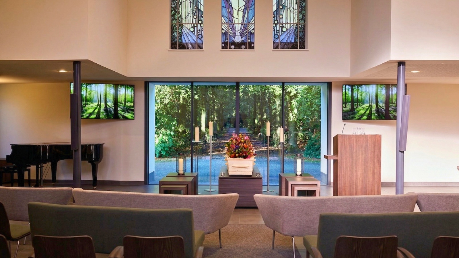 Vanuit de aangename ontvangstruimte van Crematorium Den en Rust worden uw genodigden begeleidt naar de moderne Aula Heidenburgh. Terwijl u zich met de familie voorbereidt in de familiekamer, kunnen uw genodigden een bericht achterlaten in het condoleanceregister.