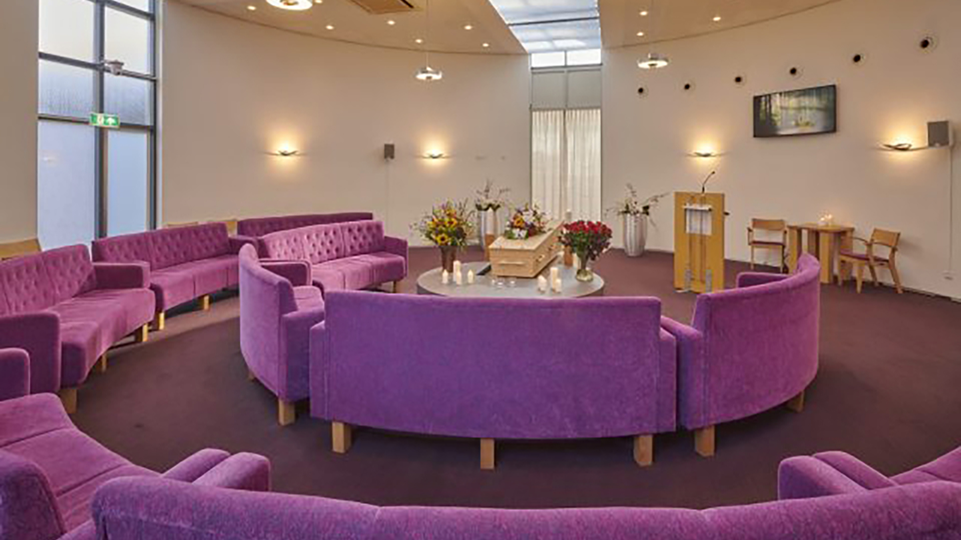 In deze prachtig vormgegeven aula, waar het warme paars van de banken samen gaat met strak vormgegeven hout en metaal, kunt u met beelden, woorden en muziek op uw eigen manier afscheid nemen van uw dierbare.