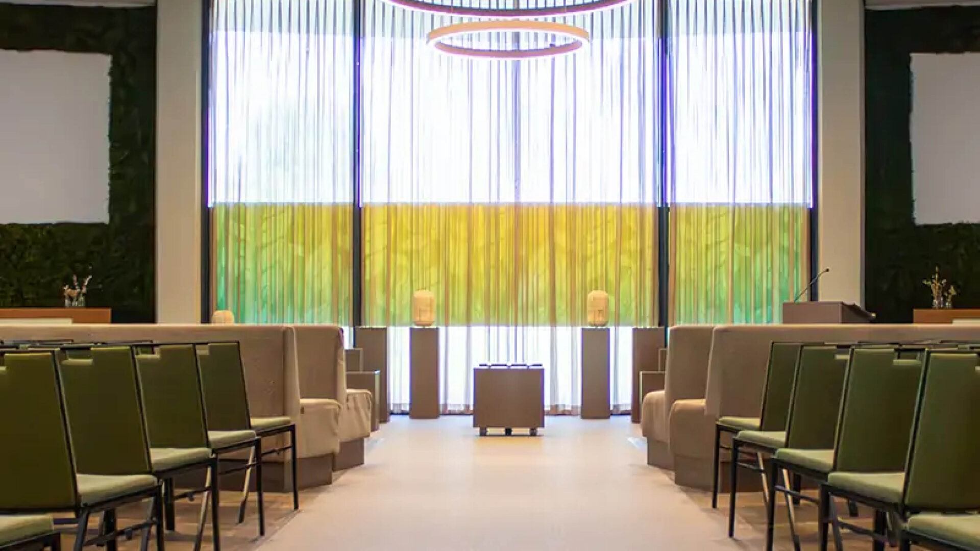 Crematorium Haskerpoort beschikt over een prachtige, ruime Aula die plaats biedt aan 400 personen. De zachte, warme kleuren van de inrichting dragen bij aan een rustgevende atmosfeer.