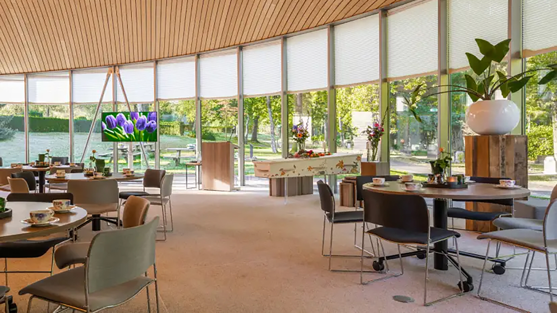 De ruimte is flexibel in te richten en is ontworpen als een rustpunt in de serene en natuurlijke omgeving van de omringende begraafplaats. De architectuur is geïnspireerd door natuurlijke vormen en materialen, zoals gebogen eikenfineer voor het plafond en grindvloeren die aansluiten bij de zandkleur van de omgeving.