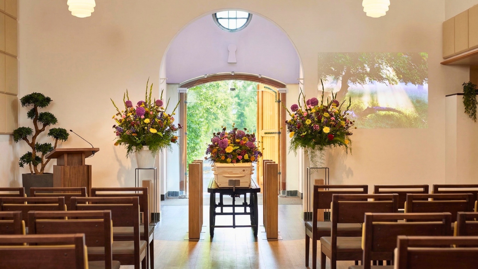 Vanuit de aangename ontvangstruimte van Crematorium IJsselhof worden uw genodigden begeleid naar de sfeervolle Aula De IJssel. Terwijl u zich met de familie voorbereidt in de familiekamer, kunnen uw genodigden een bericht achterlaten in het condoleanceregister.