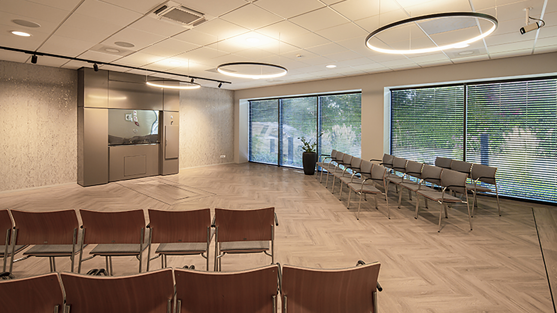 De ruimte is intiem ingericht met luxe materialen in zachte aardetinten. Met plaats voor 130 personen is de aula geschikt voor grotere groepen belangstellenden. Het is mogelijk om beeld en geluid af te spelen, voor slechthorenden is er een ringleiding en wie ver weg woont kan via een livestream de plechtigheid volgen.