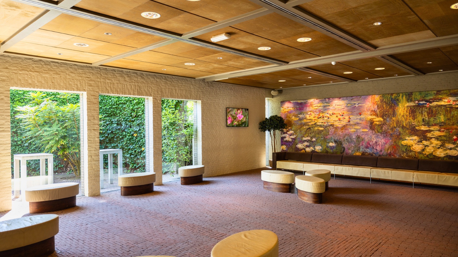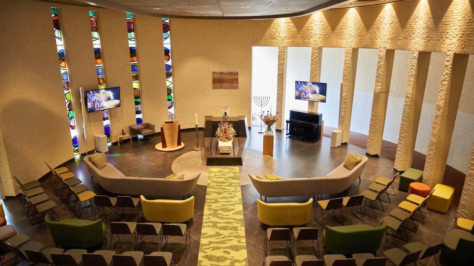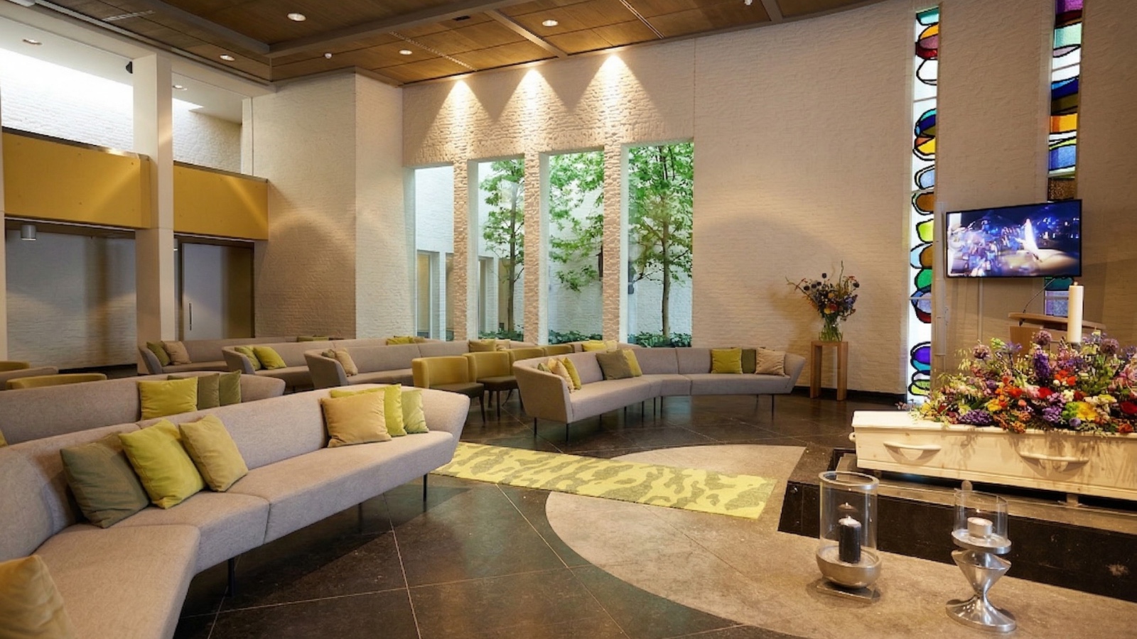 Sfeerbepalend zijn hier de kleurrijke inrichting, de halfronde opstelling van de banken en de fraaie glas-in-loodramen rond kist en spreekgestoelte. De aula beschikt over grote beeldschermen en alle moderne multimedia, daarbij staat er een piano voor live muziek. U kunt zelf de afscheidsdienst samenstellen via het online platform ‘Beeld- en geluid assistent’.
