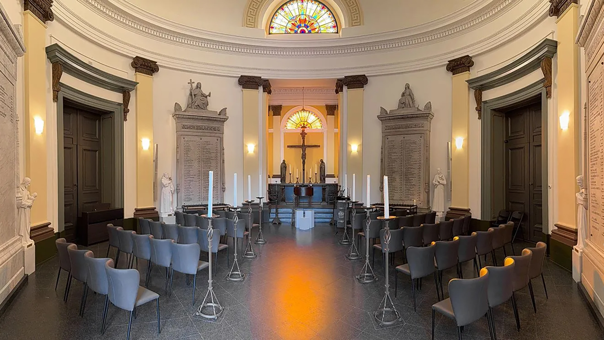 De Grote Kapel biedt plaats aan maximaal 120 personen. Nadat iedereen heeft plaatsgenomen, vangt de plechtigheid aan. De Grote Kapel is een imposante ruimte. De met hout bedekte wanden en plafond geven warmte, en men heeft zicht op de schitterende oprijlaan met aan weerszijden bomen. Dit heeft een ruimtelijk en rustgevend effect.