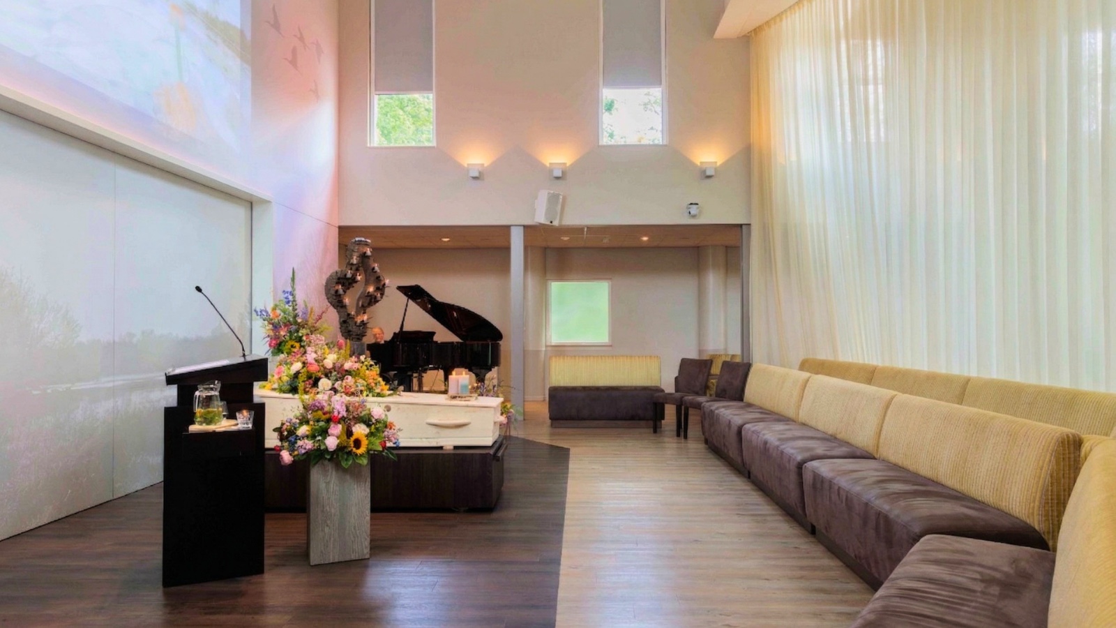 Bij aanvang van de dienst nemen allen plaats in Aula Reestborgh. Aula Reestborgh is een sfeervolle, lichte ruimte met een warme inrichting. De aula beschikt over een moderne multimedia-installatie en er staat een prachtige vleugel. Hier kunt u met uw genodigden uw dierbare gedenken met herinneringen, woorden, muziek en foto’s.
