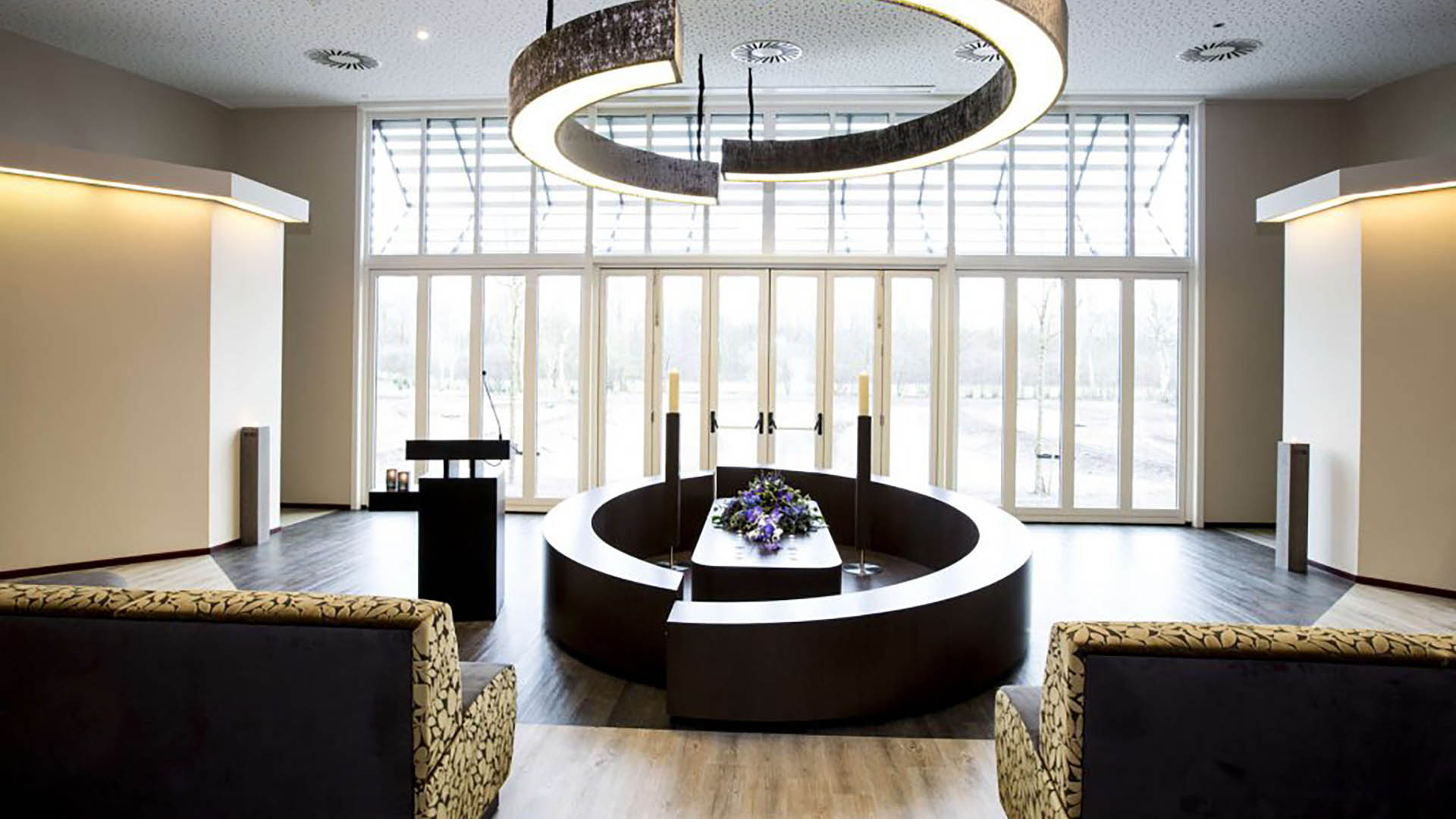 Vervolgens nemen allen plaats in Aula Heizicht, een sfeervolle zaal met uitzicht op de vijver en het bos. De ruimte is aan te passen voor een afscheid in kleinere kring en biedt 120 zitplaatsen en 30 staanplaatsen. Ook het licht is naar eigen smaak en voorkeur in te regelen.