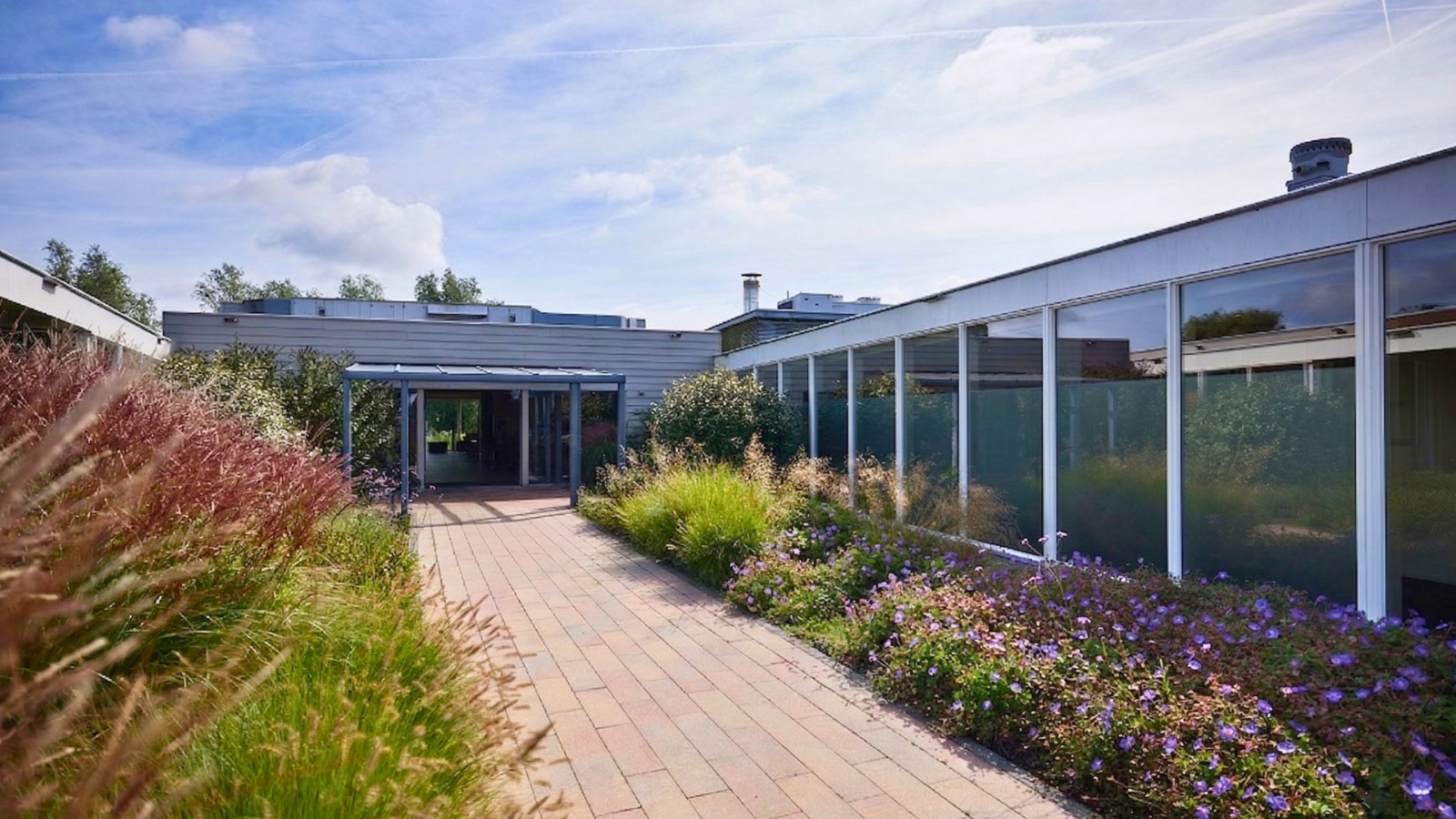 Aula met uitzicht op water en groen