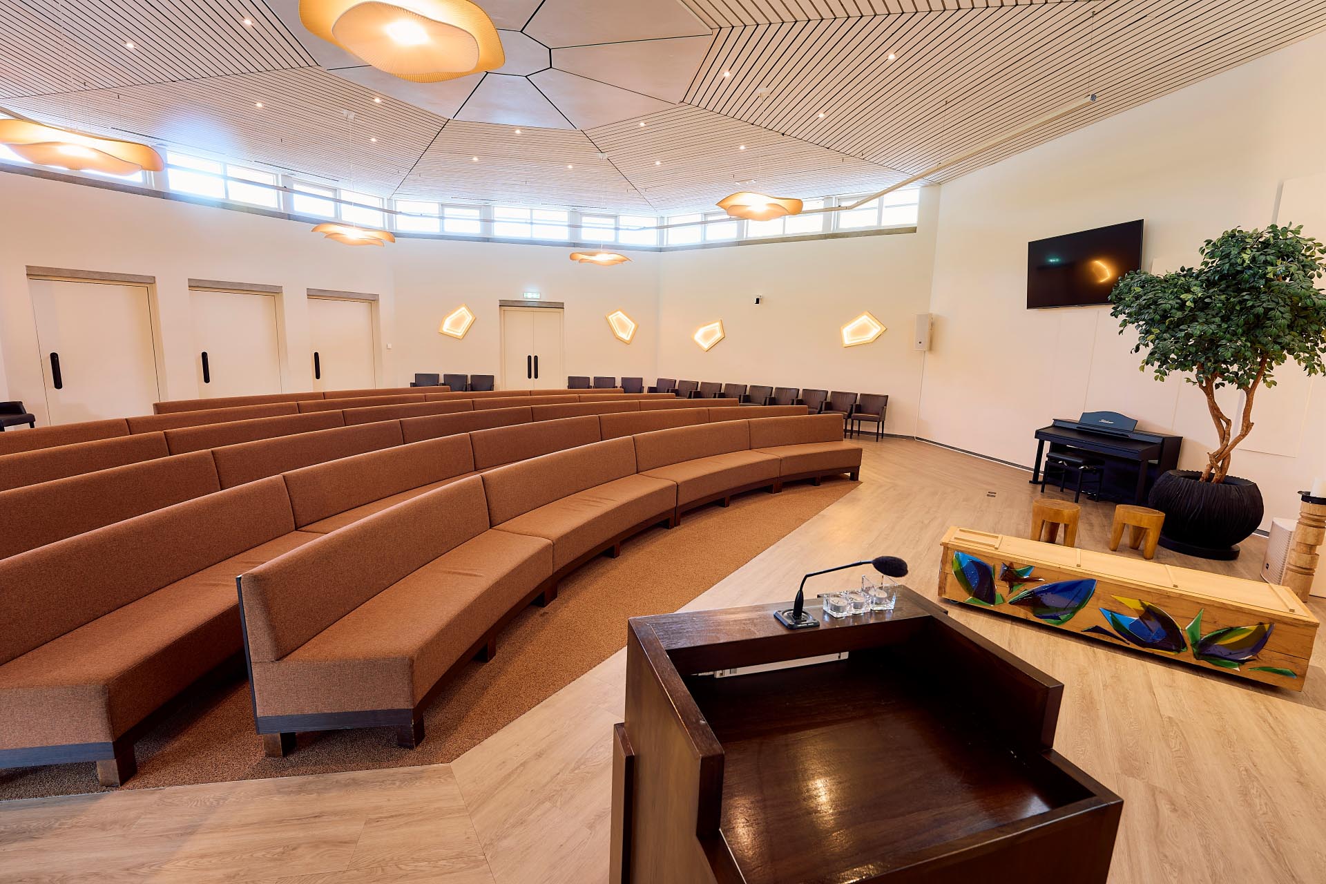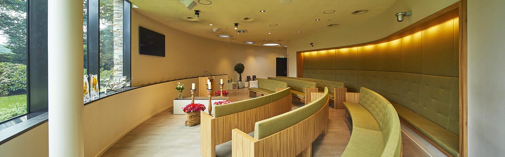 Aula Aurora biedt 120 zitplaatsen en 75 staanplaatsen, de banken in de afscheidsruimte van Aula Aurora zijn rond van vorm en vormen zo een halve cirkel rond uw dierbare, waardoor een gevoel van verbondenheid wordt gecreëerd. Grote ramen zorgen voor veel lichtinval en kijken deels uit op de tuinen rondom het crematorium. De aanwezige glas in lood ramen zorgen bij zoninval voor een mooi lijnenspel.