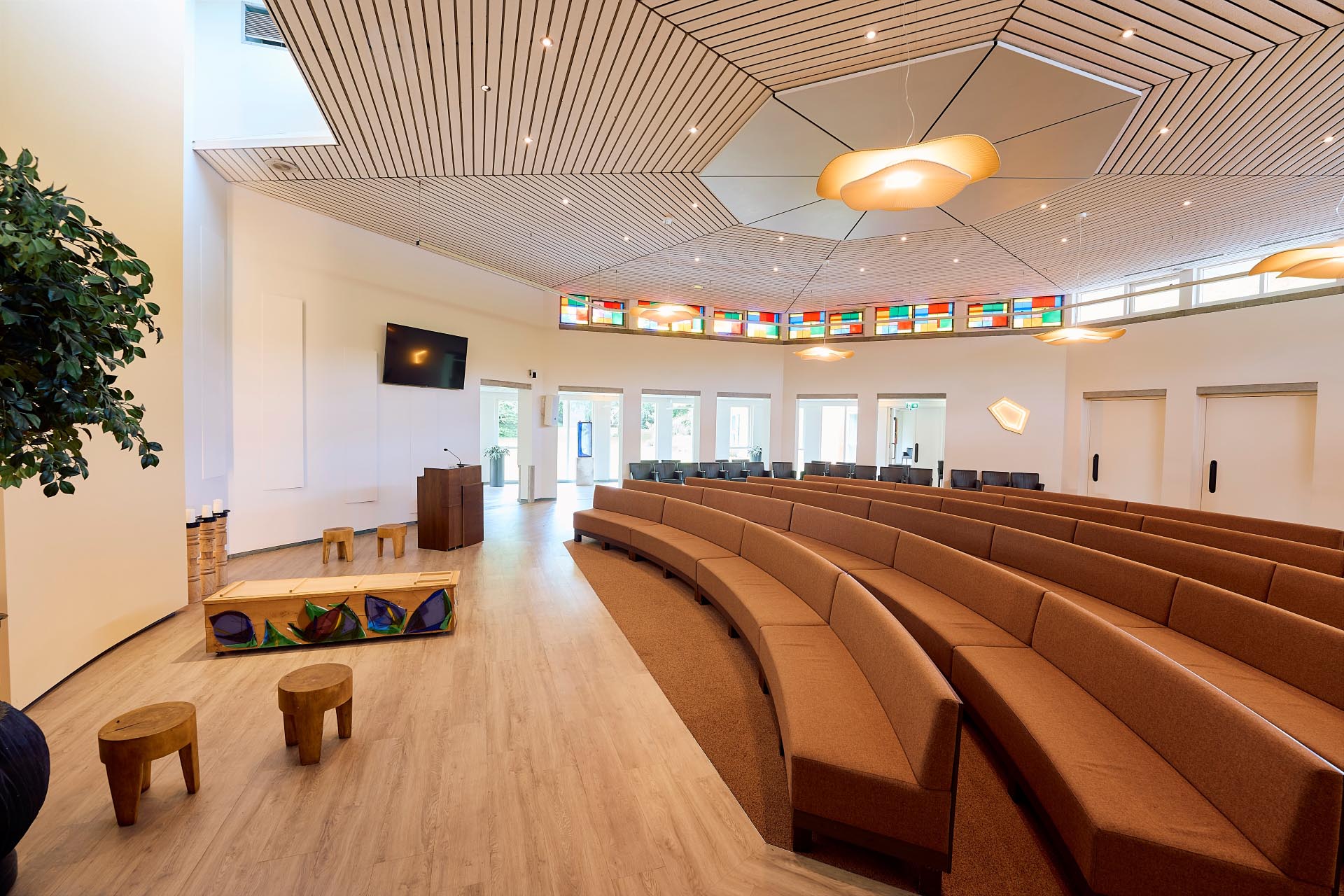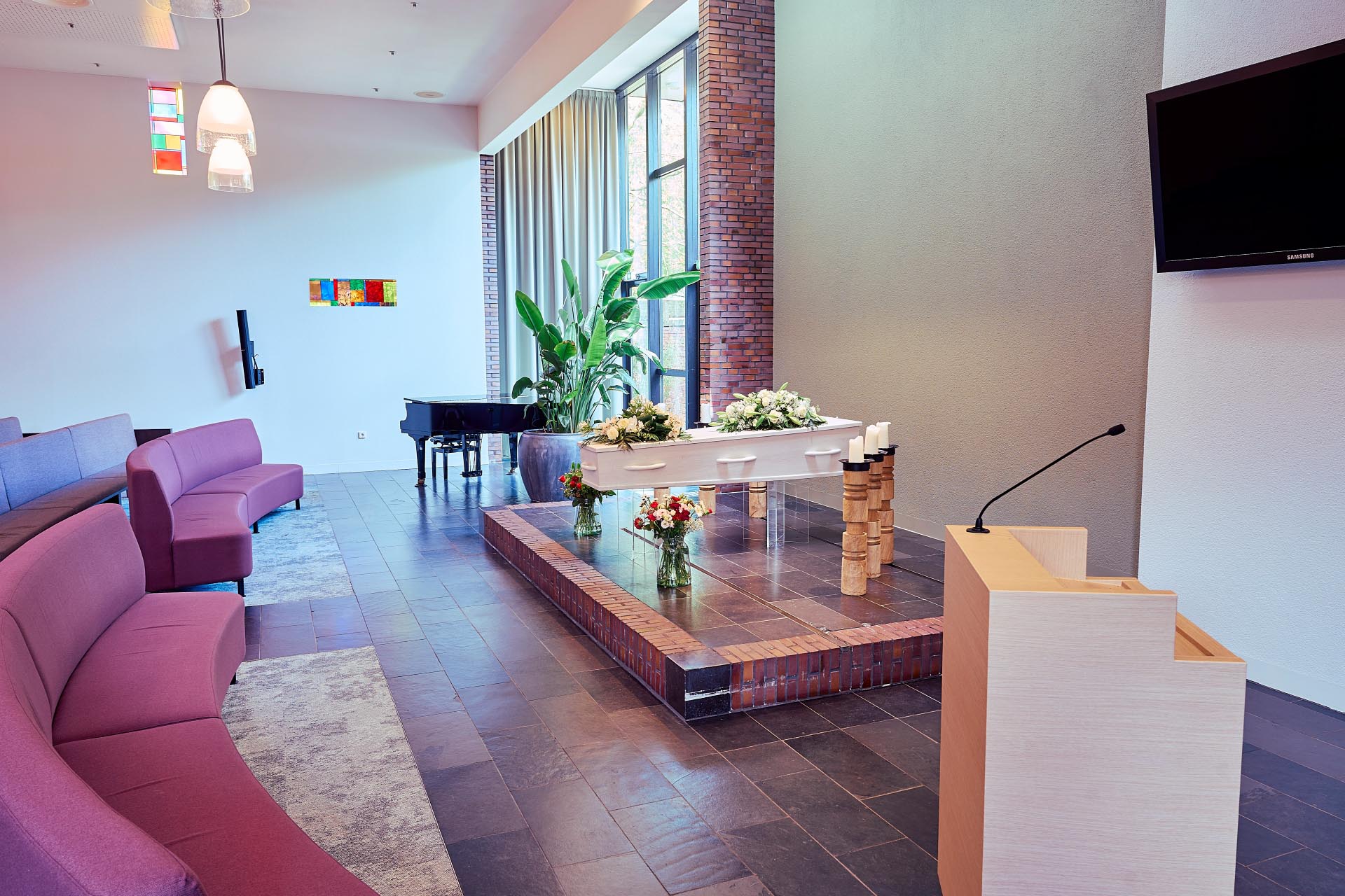 Aula Atrium, de grootste beschikbare ruimte van Crematorium Tilburg, biedt 200 zitplaatsen op comfortabele banken en 100 staanplaatsen. Mocht dit toch niet voldoende zijn dan kan de plechtigheid ook worden gevolgd via beeldschermen in de lounge.