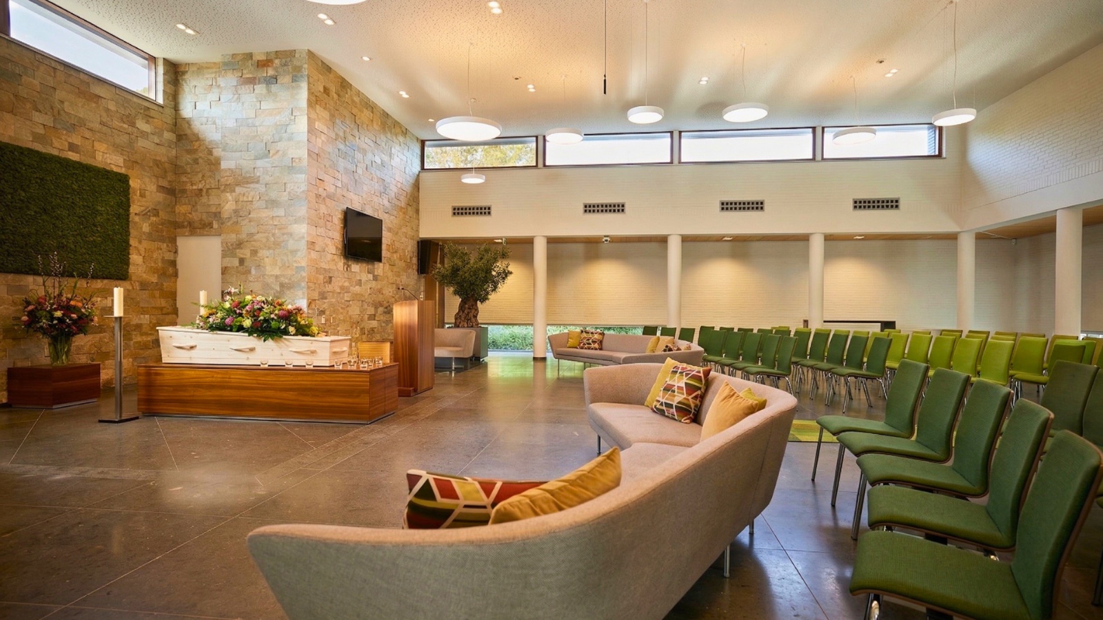 Crematorium Tussen de Bergen in Roermond is rustig gelegen in een groene omgeving naast de gelijknamig begraafplaats. Dankzij de sfeervolle en huiselijke ruimtes is dit een fijne plek voor een persoonlijk en bijzonder afscheid van een dierbare.