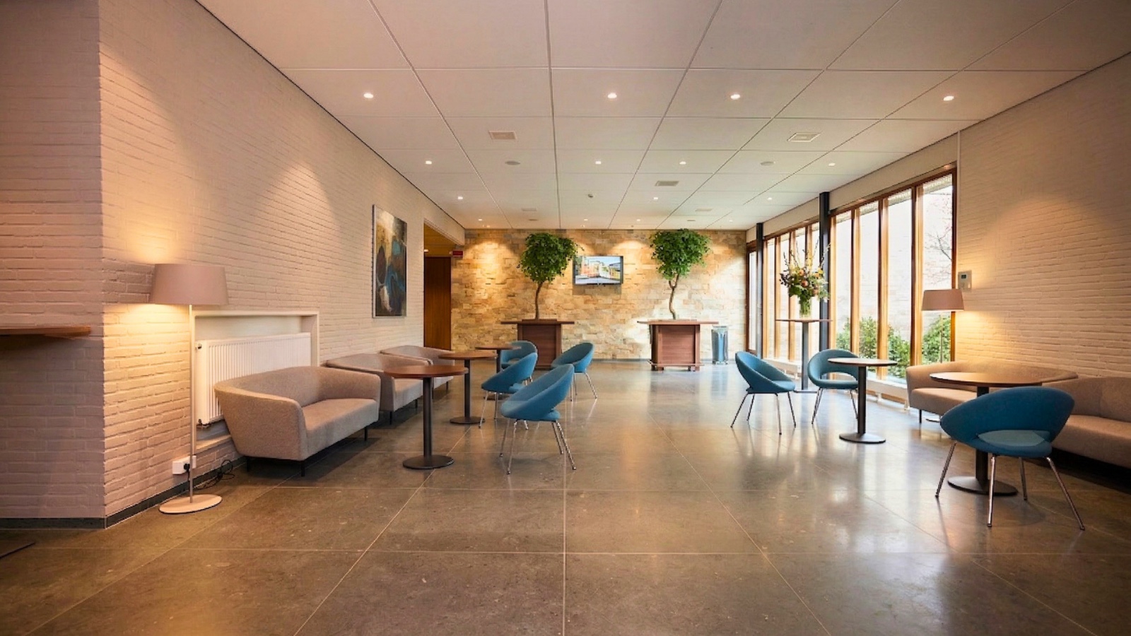 Het gebruik van diverse soorten natuursteen refereert aan de traditionele Limburgse bouwstijl. Ook in de muren van de Aula zijn deze steensoorten terug te vinden. Door de warme kleuren van het meubilair ademt het geheel rust en huiselijkheid.