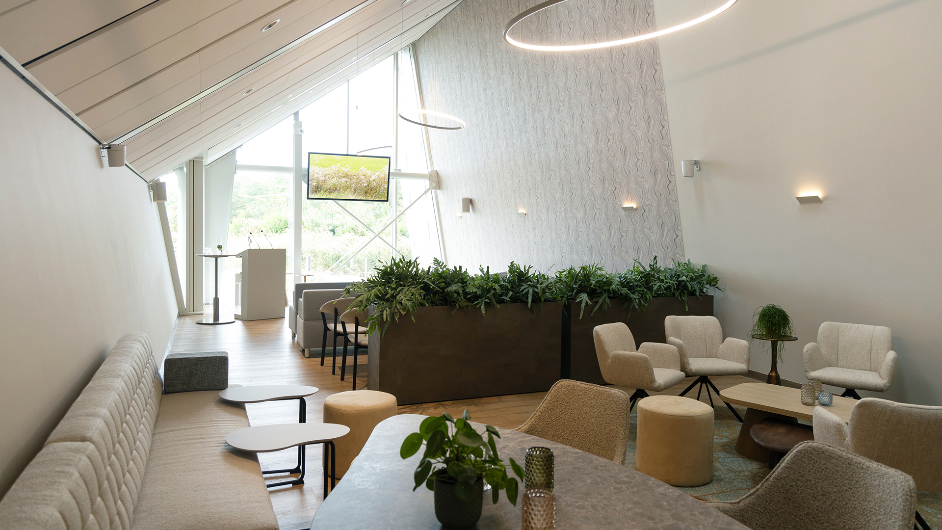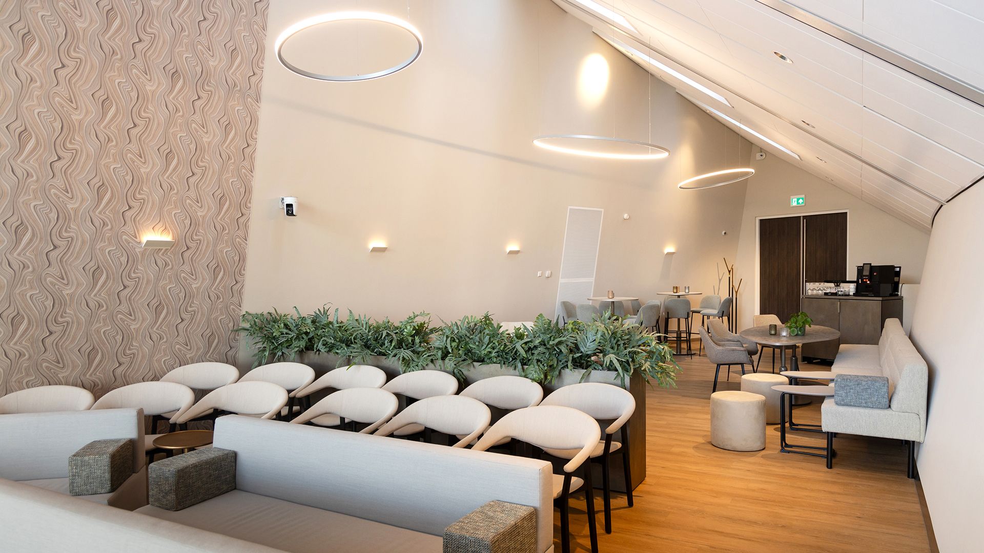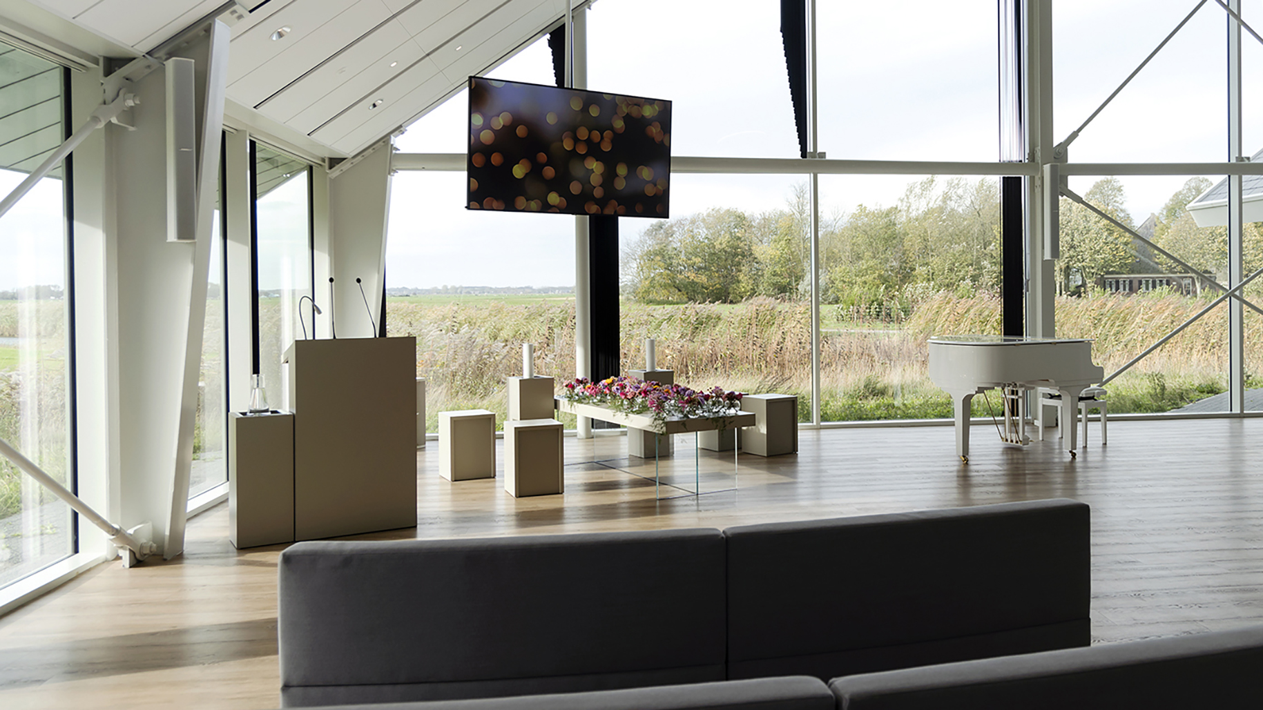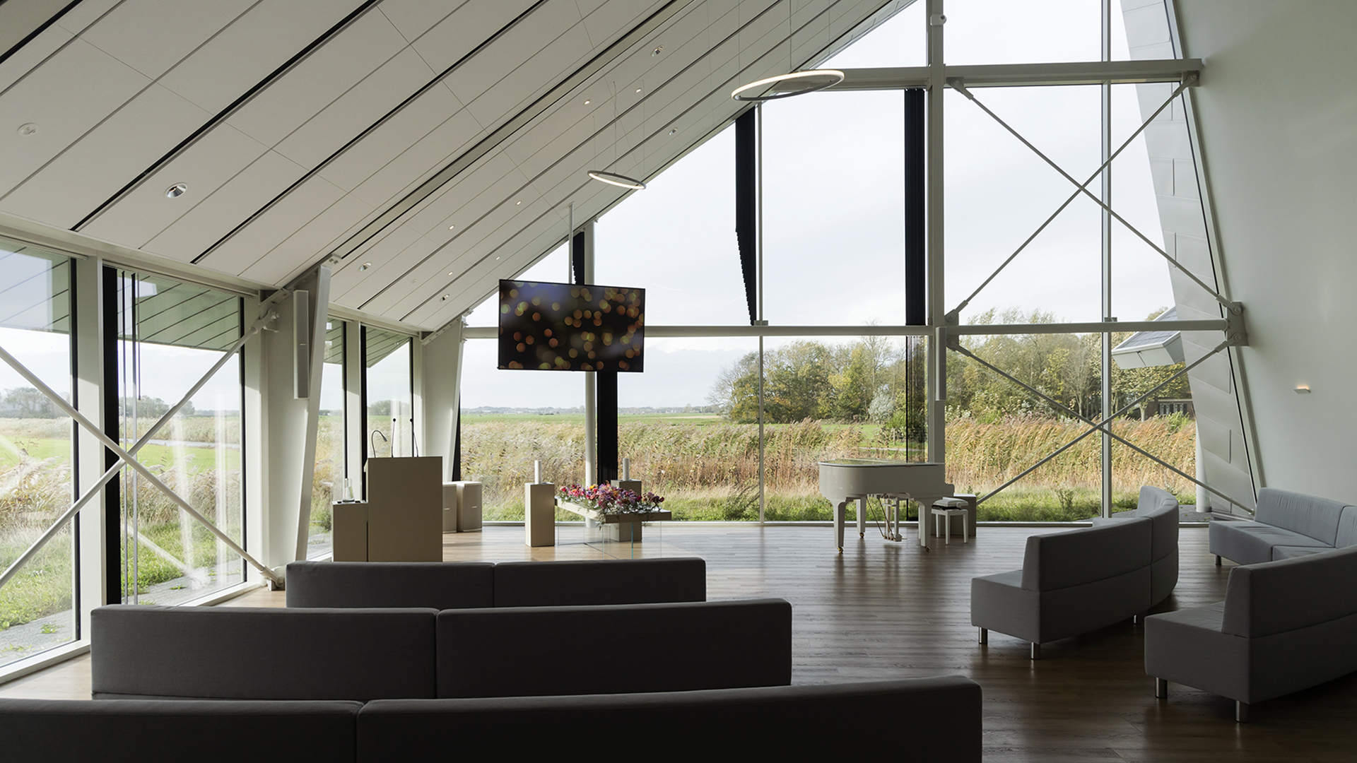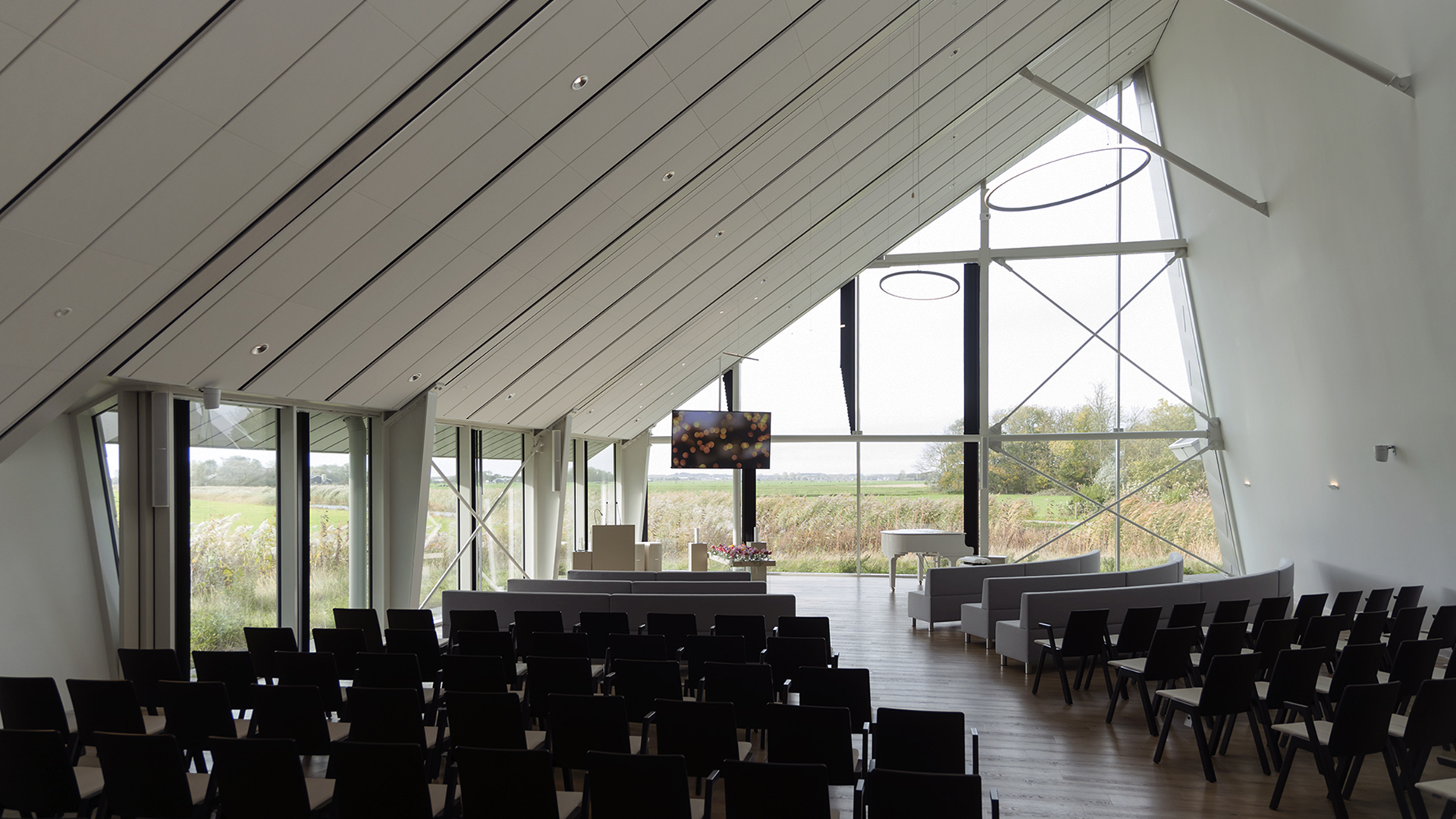 Crematorium en Uitvaartcentrum Alkmaar beschikt over twee aula’s, De Groot en De Viaan. Kenmerkend zijn de ruimtelijke en lichte uitstraling door de hoge plafonds en de grote ramen en het weidse uitzicht over het polderlandschap en de duinen van Egmond in de verte.