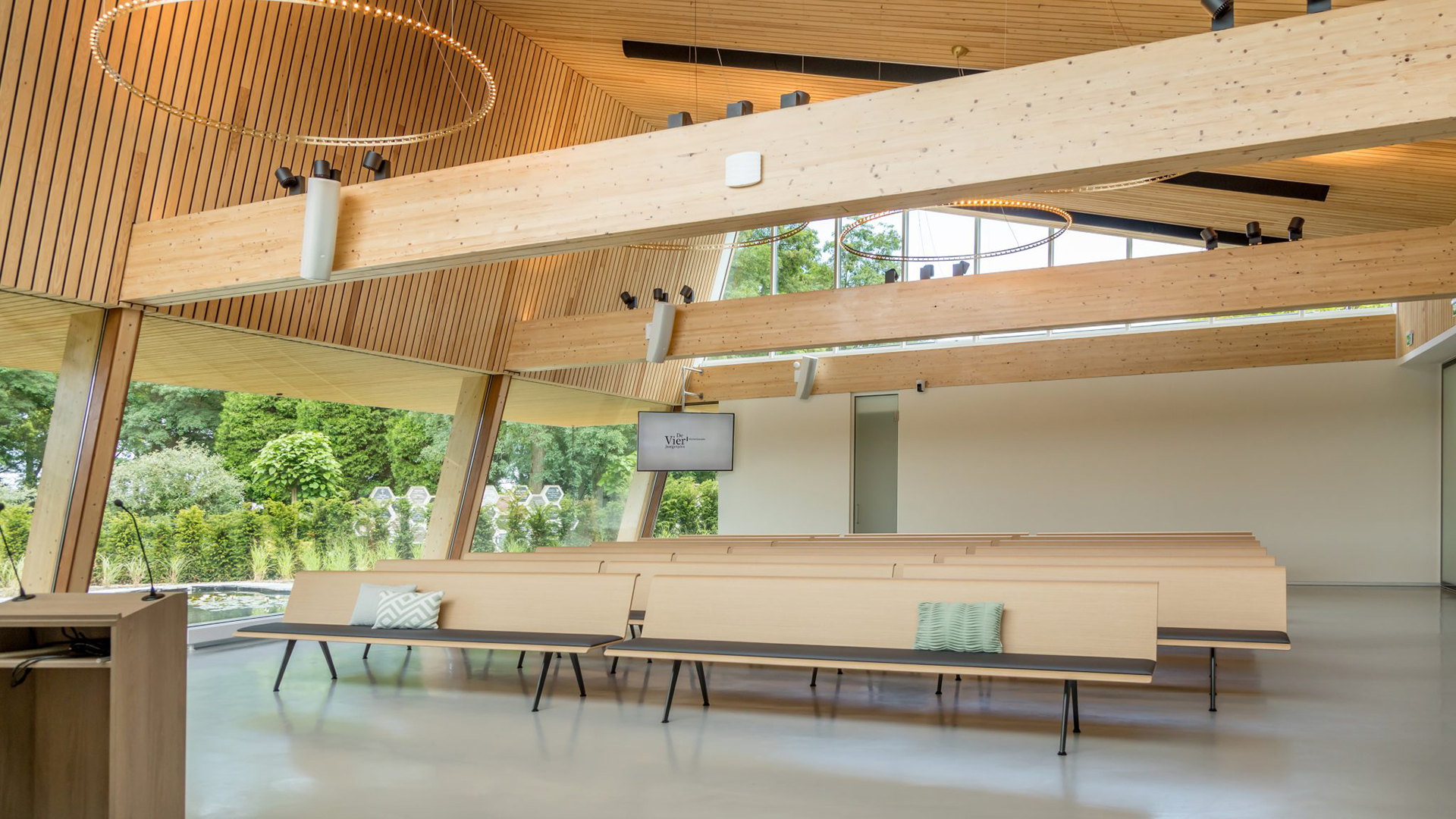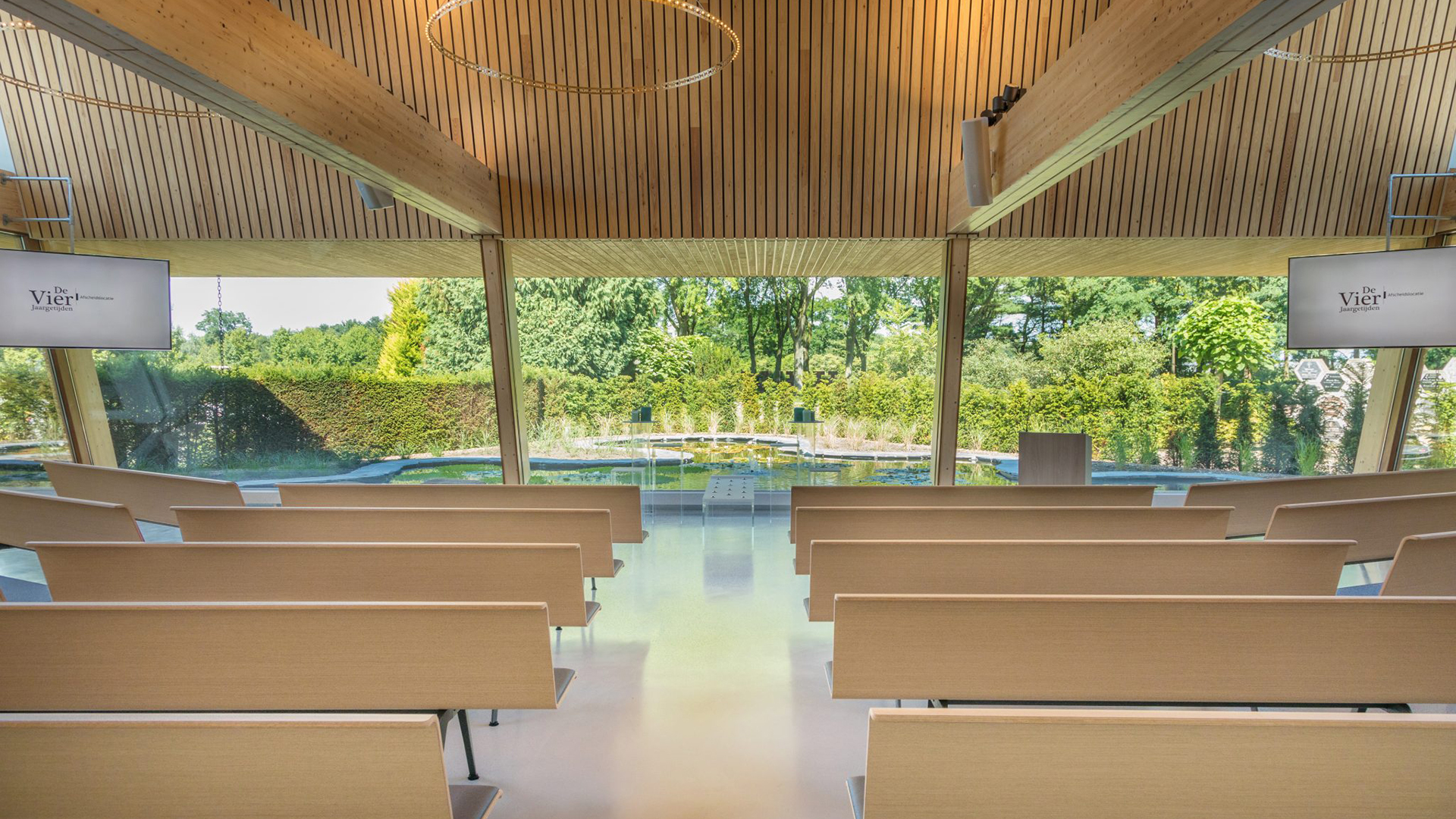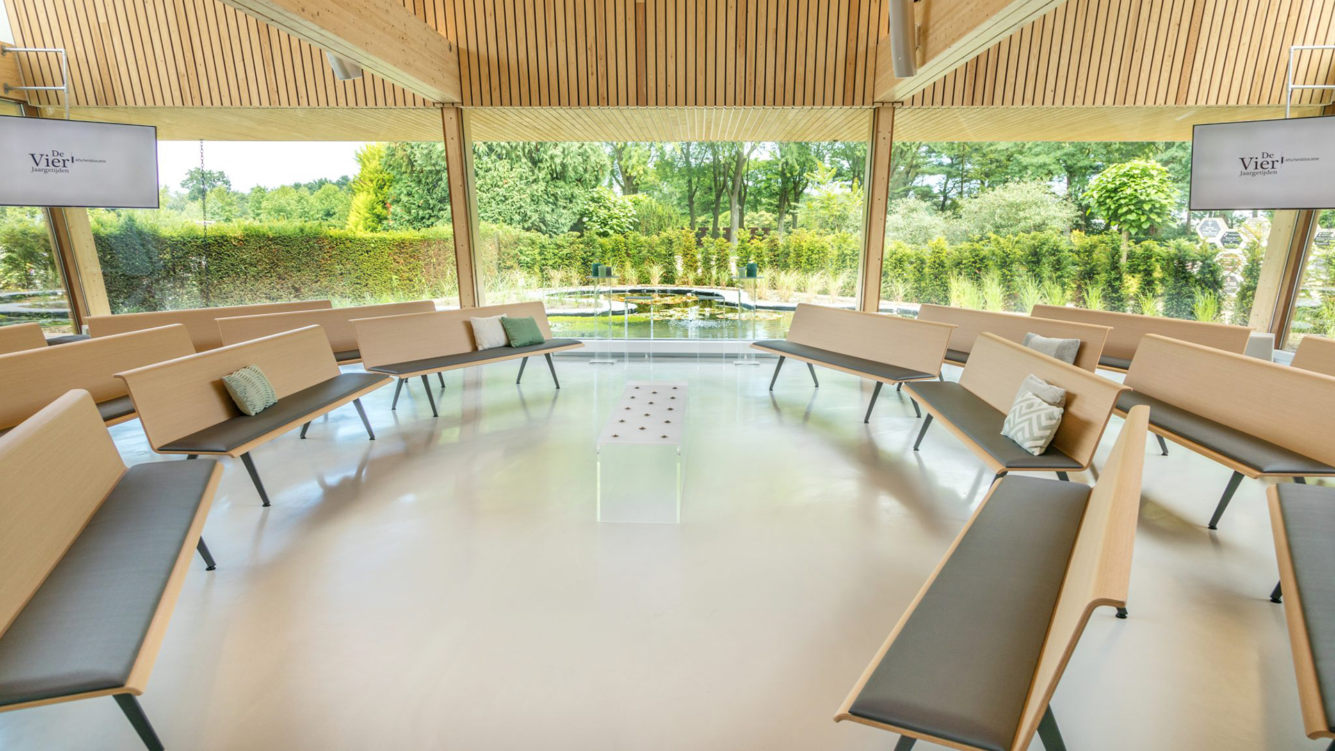 Aula De Vier Jaargetijden biedt plaats aan 80 personen, op banken die in diverse opstellingen voor u kunnen worden klaargezet: in rechte rijen, in gebogen rijen met uitzicht op binnentuin en vijver en in een kring waarin uw overleden dierbare een centrale plaats inneemt en als het ware wordt omarmd.