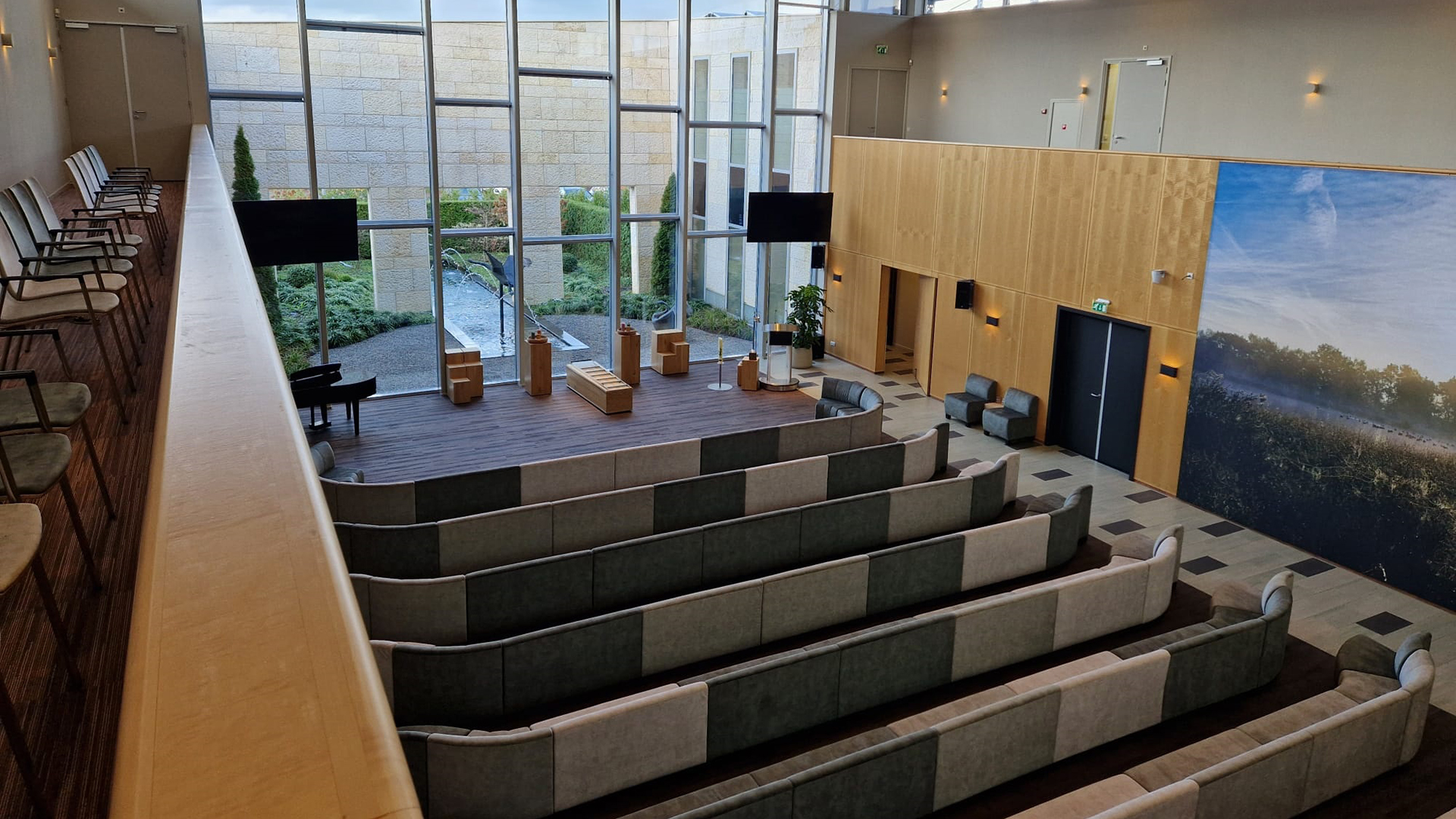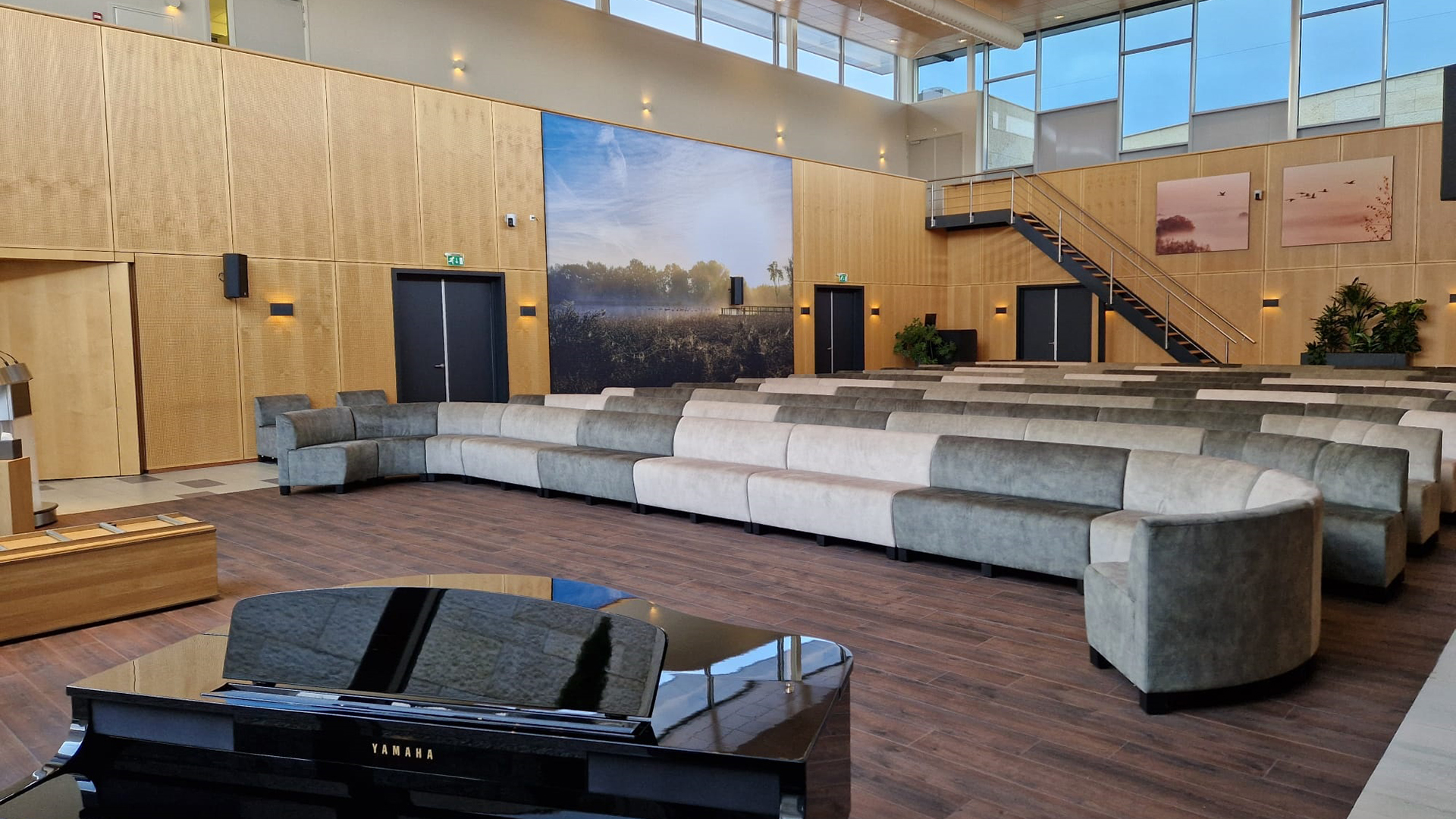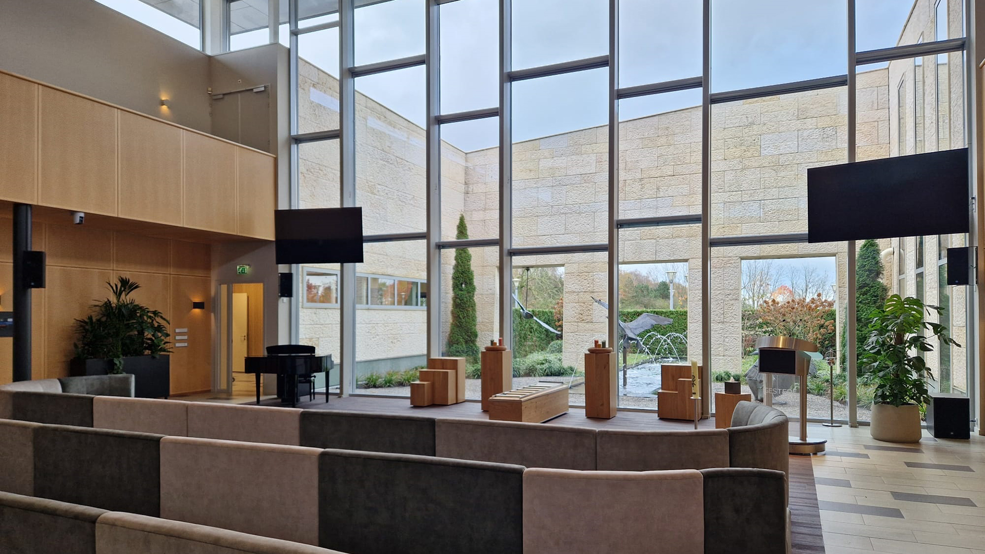 Aula De Vier Jaargetijden biedt plaats aan 80 personen, op banken die in diverse opstellingen voor u kunnen worden klaargezet: in rechte rijen, in gebogen rijen met uitzicht op binnentuin en vijver en in een kring waarin uw overleden dierbare een centrale plaats inneemt en als het ware wordt omarmd.