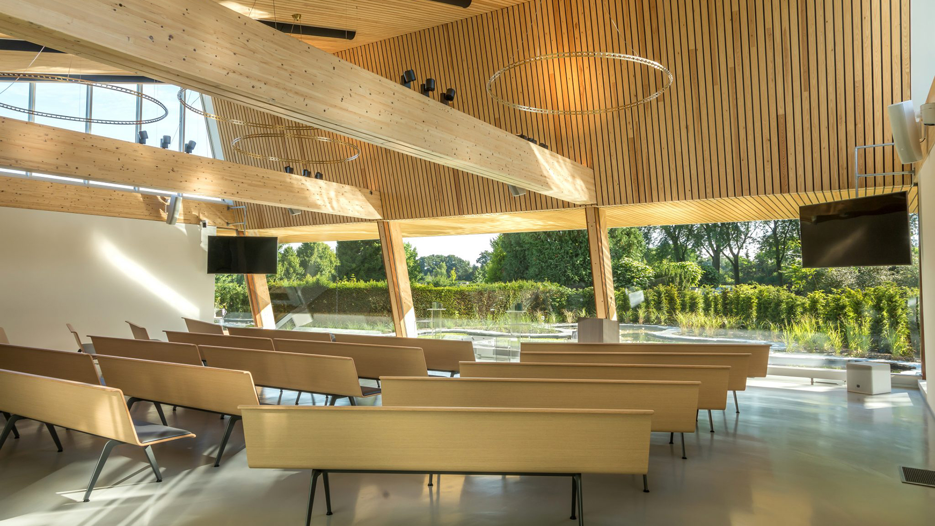 De aula beschikt over uitstekende faciliteiten om een persoonlijk en warm afscheid vorm te geven zoals twee tv-schermen, apparatuur voor opnames en livestream, een ringleiding en de mogelijkheid om versterkte apparatuur aan te sluiten op het aanwezige geluidssysteem.